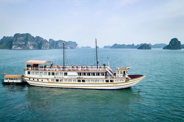 Embark on a unique 2-day, 1-night journey through the serene and less-traveled waters of Bai Tu Long Bay with the Garden Bay Cruise. This carefully curated itinerary offers an intimate experience of the bay's unspoiled beauty, with longer cruising times allowing for a deeper exploration of this magnificent region. On the first day, you'll set sail from Sunworld International Harbor, making your way to the picturesque Cap La Island, where you can kayak, swim, and sunbathe in the tranquil surroundings. As the day draws to a close, enjoy a sunset party on the sundeck before participating in a Vietnamese cooking class and savoring a delicious BBQ dinner under the stars.
