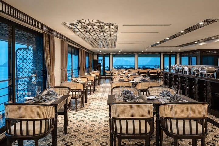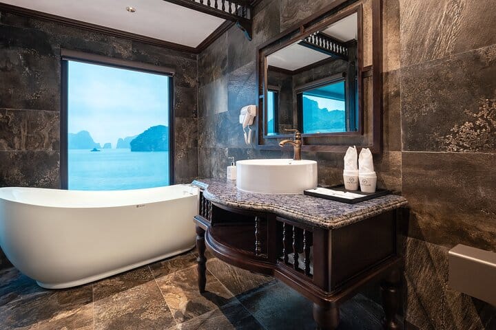 Venus Cruises is one of the very few vessels in Ha Long Bay – Lan Ha Bay equipped with an elevator providing access to all decks. All rooms on Venus Cruises are more spacious than those on most other boats in the bay, featuring floor-to-ceiling windows, large private balconies, and modern amenities (including a Jacuzzi tub, standing shower, and smart bidet). Every room is individually fitted with its own private Jacuzzi bathtub.Furthermore, Venus Cruises' functional areas (spa, restaurant, bar, public Jacuzzi pool, etc.) are all furnished with luxurious and modern interiors. The Cruise staff team consists of seasoned professionals with many years of experience serving in the Bay, ensuring the provision of the best possible service and bringing the most satisfying experience to every guest on the cruise.